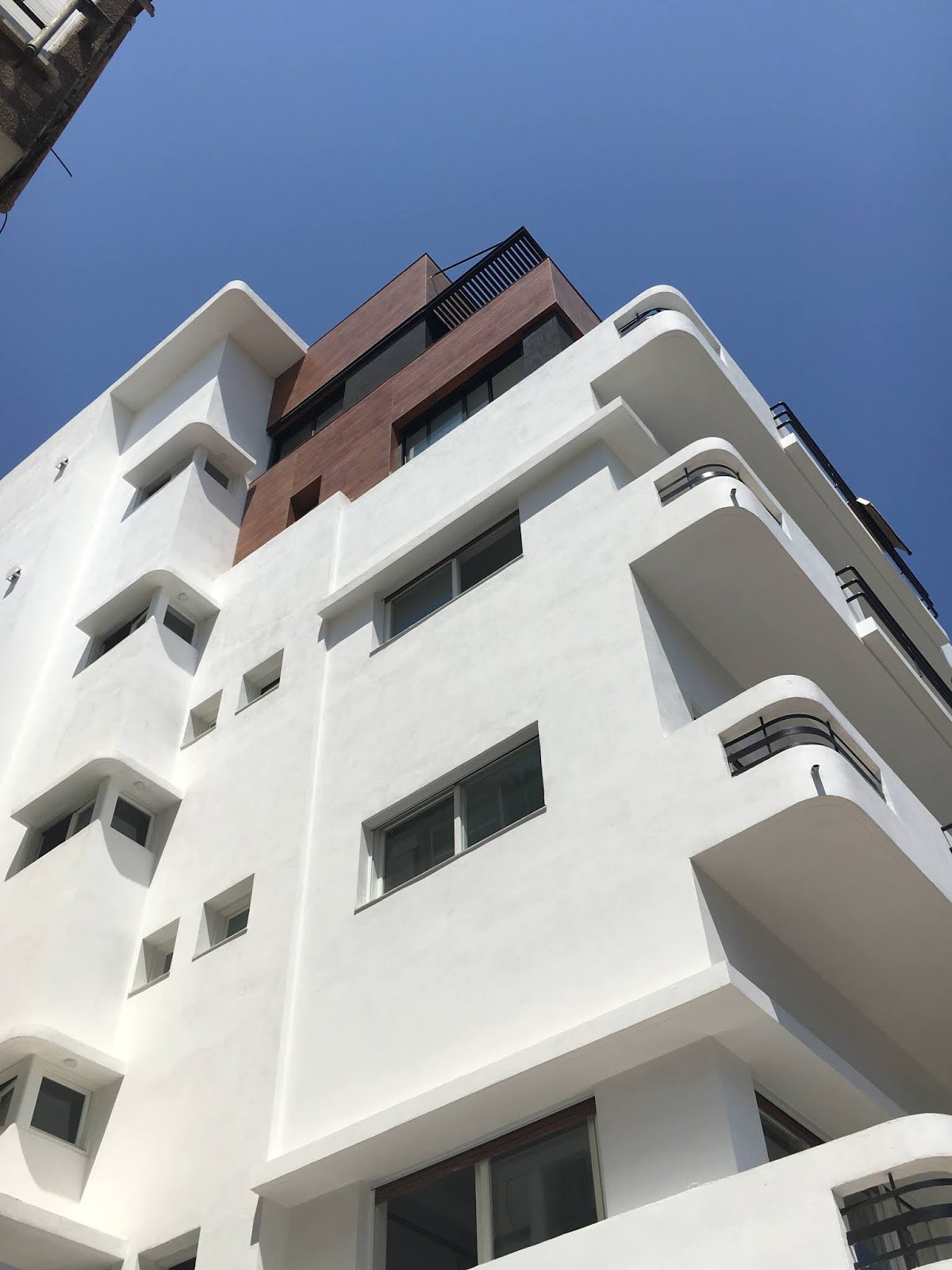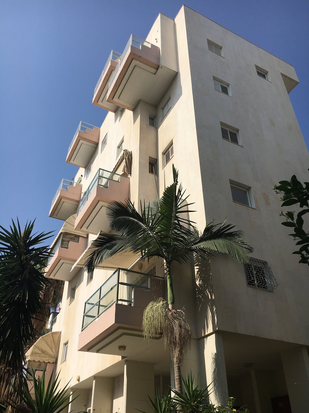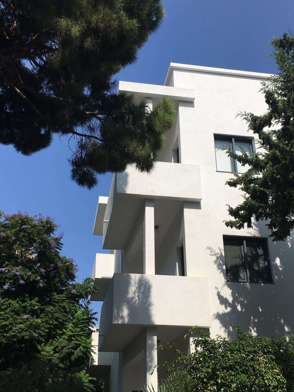 Når man går i Tel Avivs gader, bør man altid kigge op, for de mest fantastiske terrasser og tage kommer frem. Noget af det første jeg lagde mærke til, da jeg kom til Tel Aviv, var de mange hvide bygninger, med de simple facader. Selv de mindre velholdte så slående ud mod den blå himmel og ofte omringet af palmer og røde Hibiscus buske. Senere fandt jeg ud af, at Tel Aviv har en unik samling af Bauhaus-bygninger, og med rette kaldes Den Hvide By. Samlingen er så unik, at byen er kommet på UNESCO’s World Heritage-liste.