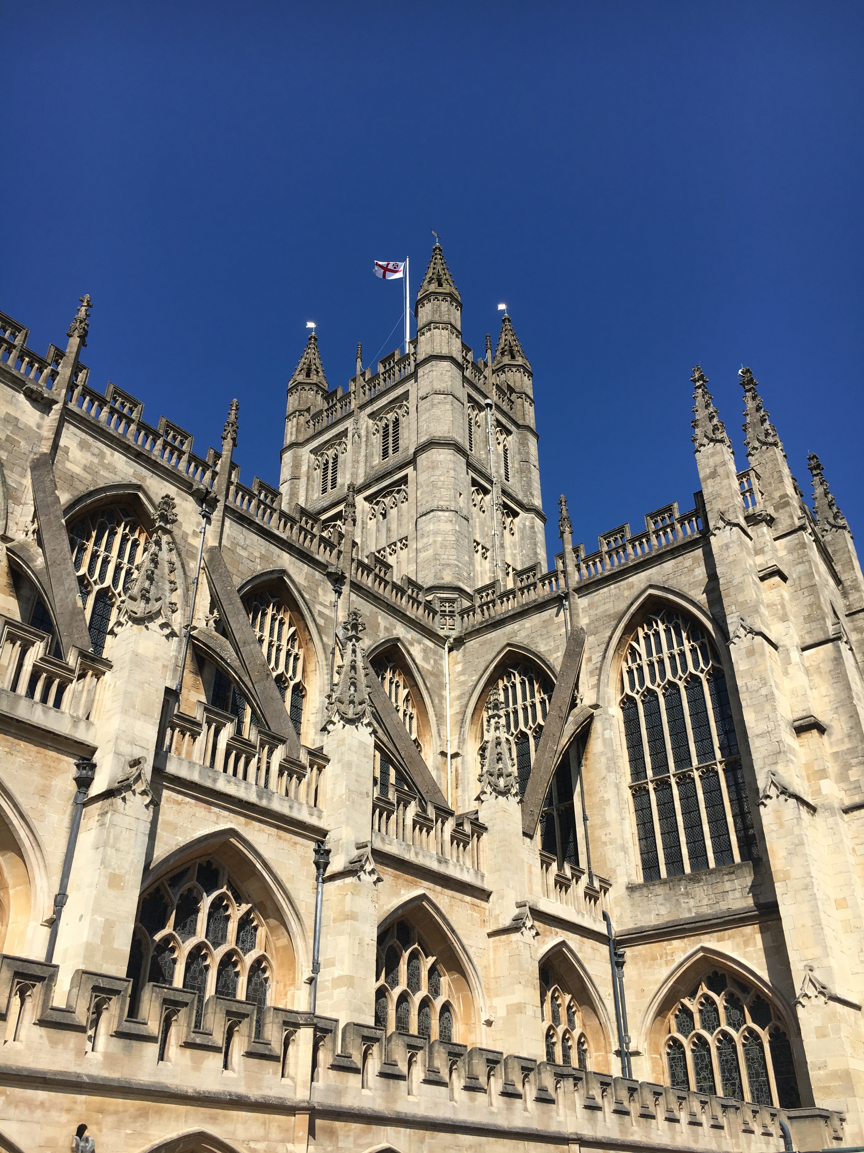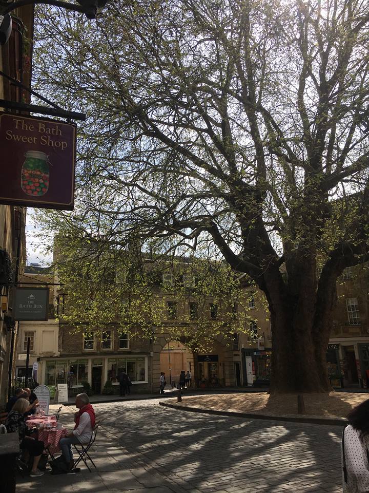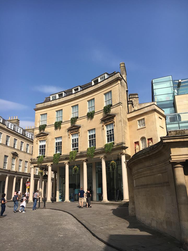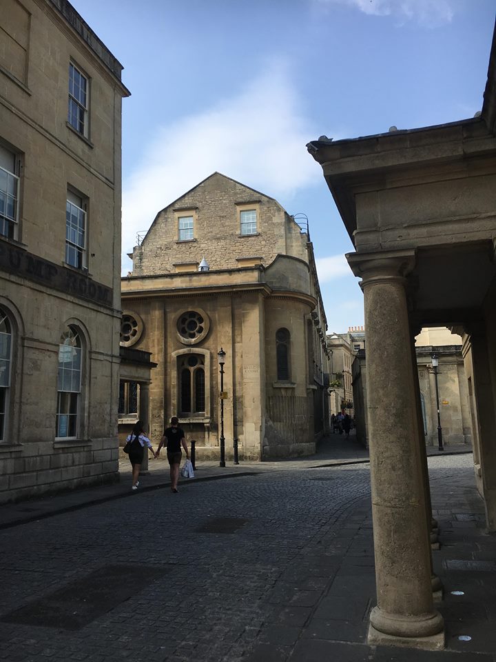 Bussen stoppede på stationen i centrum af Bath, hvor min veninde ventede. Vi spiste frokost i solen på en hipster-venlig cafe, Boston Tea Party. Jeg fik en dejlig vegetar burger og en friskpresset limonade.Herefter gik vi tur gennem byen, som huser flere interessante steder for Jane Austen fans, da hun boede her (bl.a. på Trim st.) fra 1801-1806. Da Austen boede i Bath, var byen en attraktion for det bedre borgerskab samt de kongelige. Hovedårsagen var de romerske bade (deraf bynavnet), som nok stadig er grunden til, at folk kommer til. Idet de rige slog sig ned i korte og længere perioder af året, er byen også rig på georgiansk arkitektur (mest kendt er Royal Cresent), museer, spisesteder, pubber, et casino og et teater.