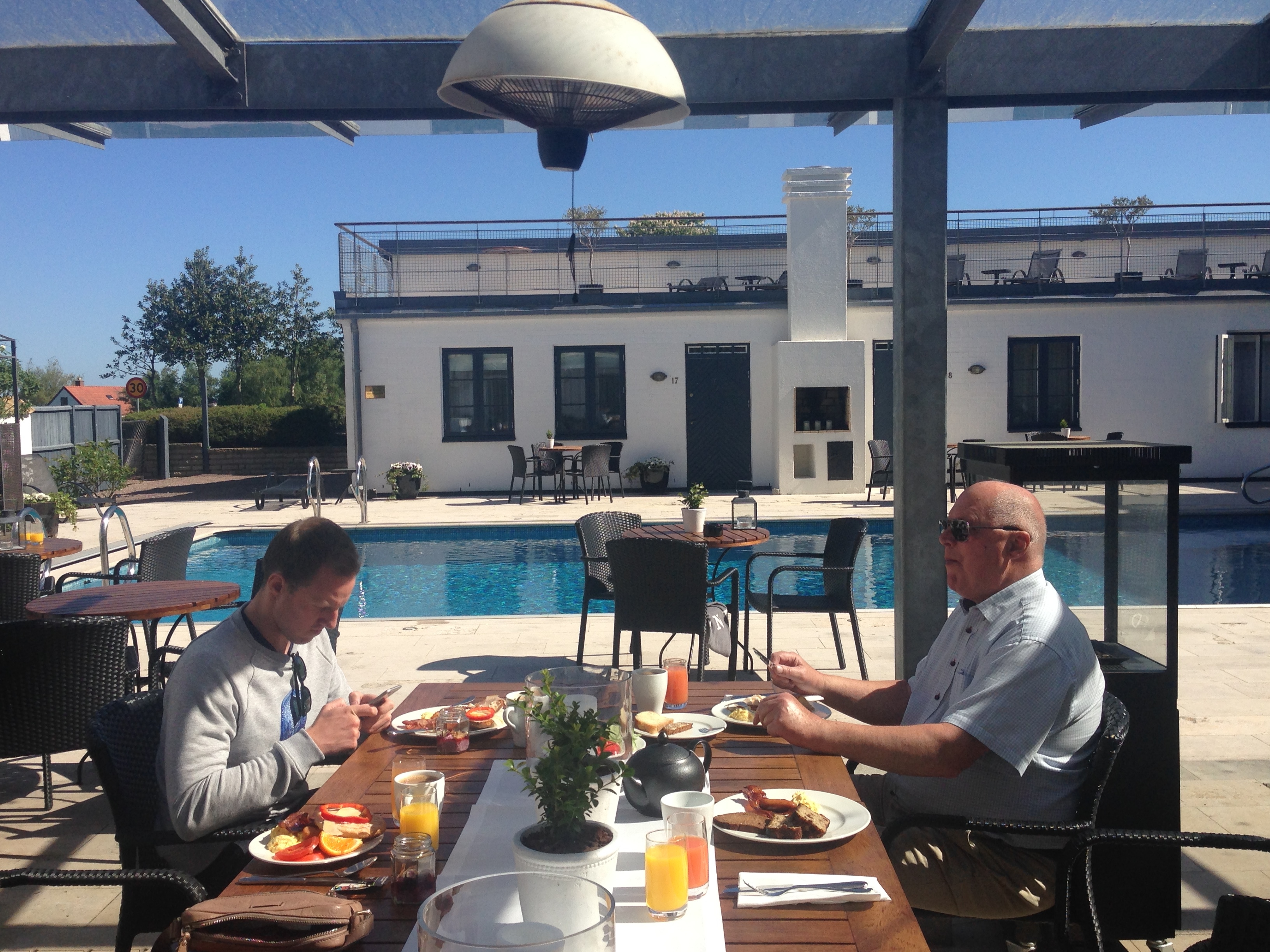 Her stiller du bilen ved den lokale benzintank og lejer gode cykler inkl. kurv til 60 DKK. pr. stk. for en hel dag.* Du cykler ad hovedgaden mod det lokale supermarked, ICA, og bag ved dette finder du Café Stationen, som er en lille hyggelig café med udmærket mad til beskedne priser (check åbningstider). Fortsætter du i stedet 200-300 m ad hovedgaden, møder du på din højre hånd Hotell Spelabäcken. Her tilbyder de en enkel, men meget lækker morgen buffet til beskedne 70 DKK.