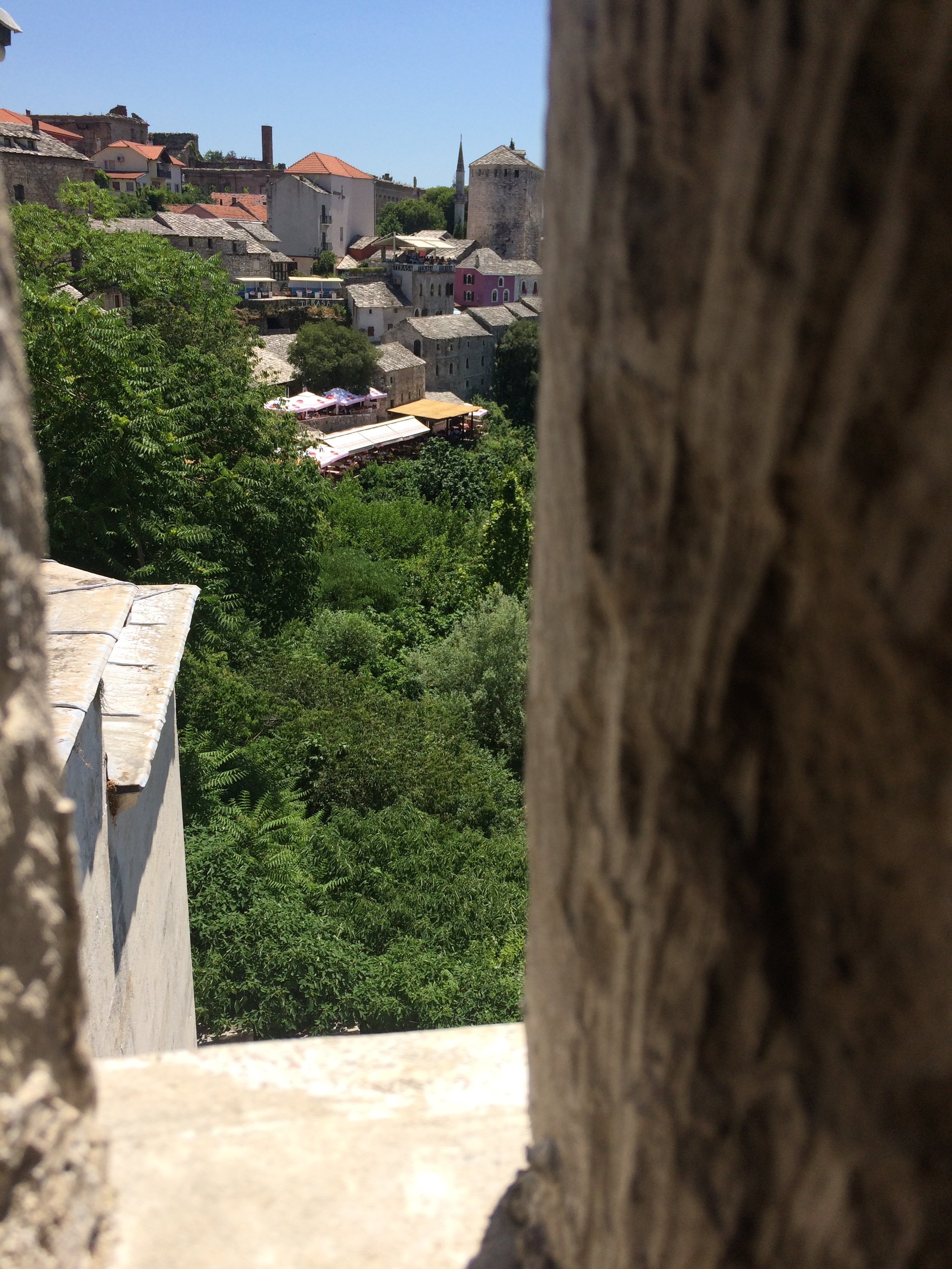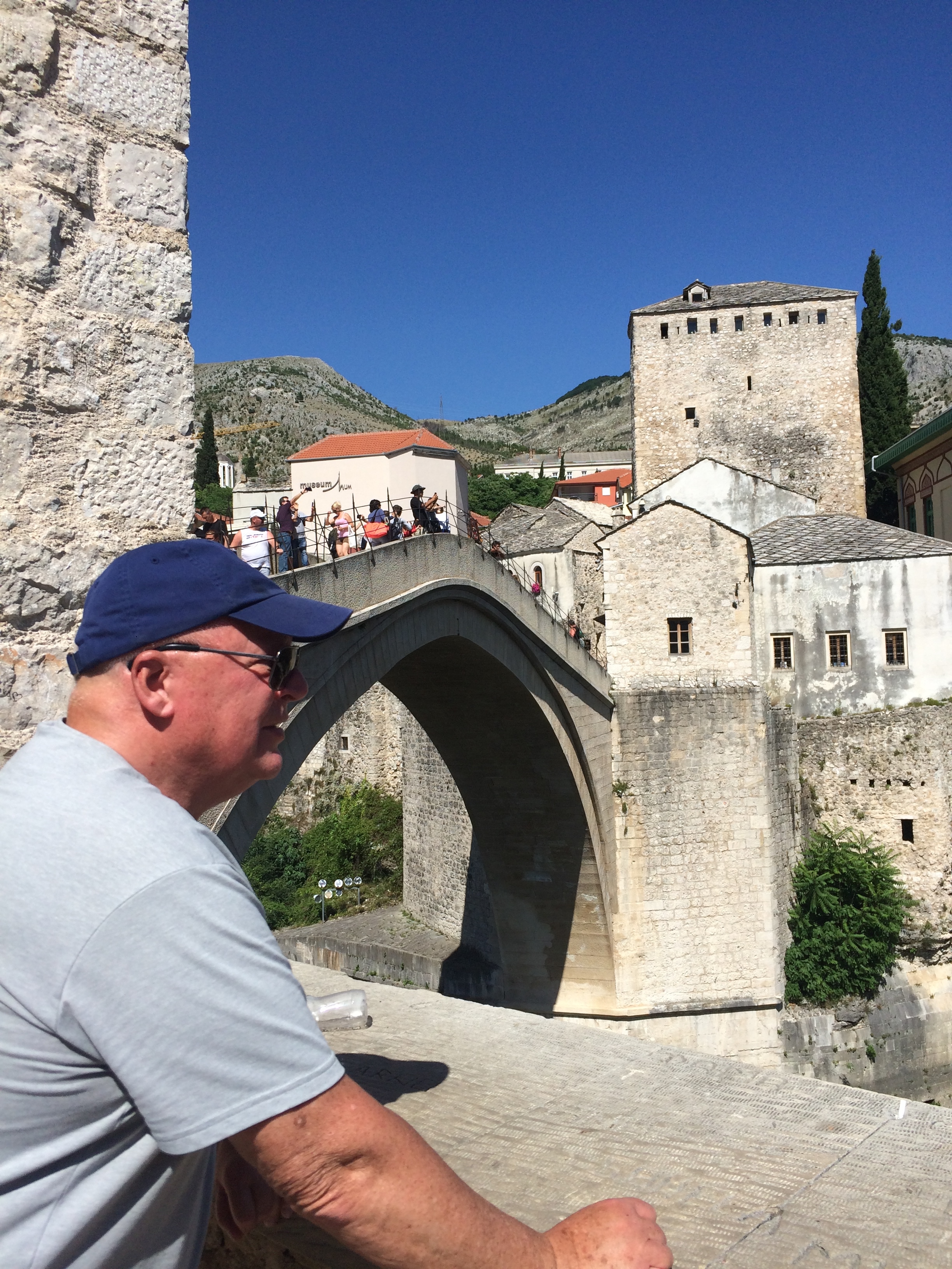 Vores dag blev tilbragt i Mostars Old Town. Vi kunne ikke få nok af den fantastiske udsigt mod de grønne bjerge, og floden Neretva der smyger sig gennem landskabet, som en sølvkæde, kreeret af en dygtig smykkekunstner. Mange pauser blev holdt, ofte på en af de utallige restauranter med deres små terrasser næsten hængende ud over floden. Disse steder er desværre et “no go” for kørestole. Det helt store trækplaster i Mostar, er en bro, den er heldigvis let tilgængelig. Broen hedder Stari Most, eller bare Mostar Bridge, er på Unescos verdensarv liste, og centrum for unge modige mænd der springer ud fra broen og 20 meter ned i det grønne vand. Dog først efter at have brugt en lille halv time på at samle penge ind hos de mange tilskuere. Den oprindelig bro er fra 1600 tallet og bygget af tyrkerne. Stari Most betyder på bosnisk “broen over floden”. Under Balkan krigen i 90’erne, blev broen i 1993 sprængt i luften af Kroatiske styrker. Med hjælp fra omverdenen blev den genopbygget i årene 2001-2004.