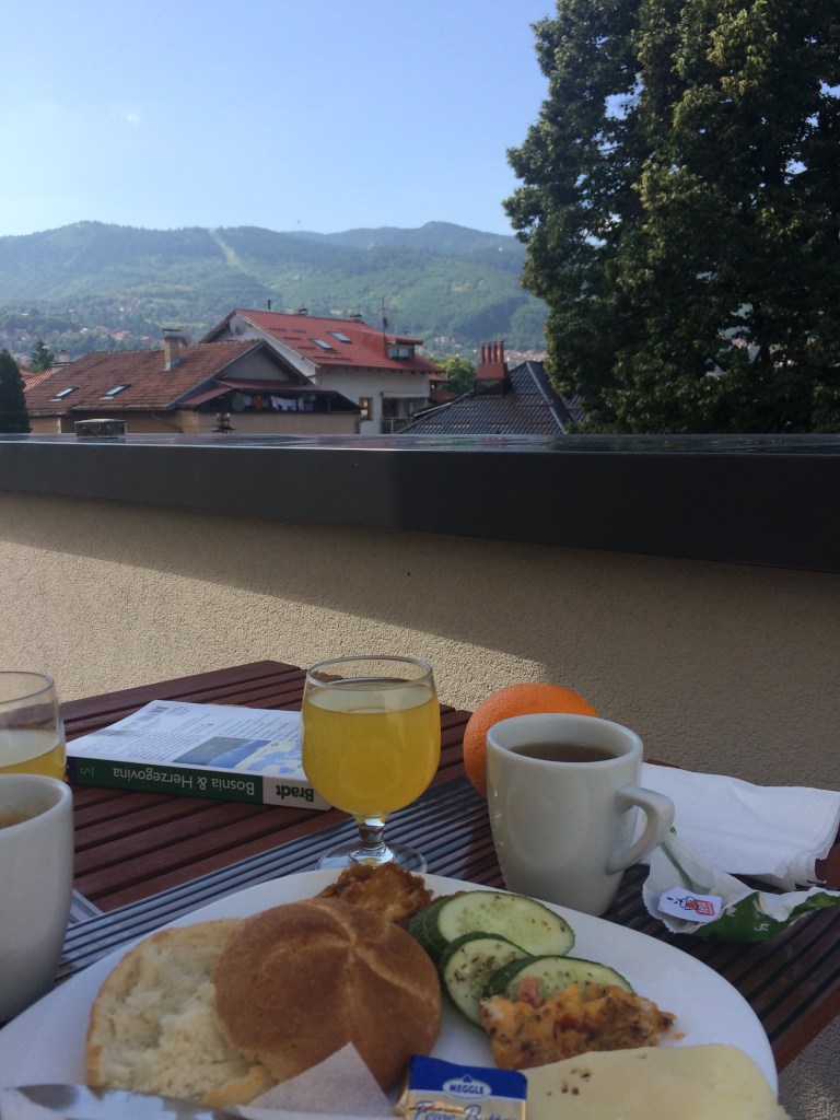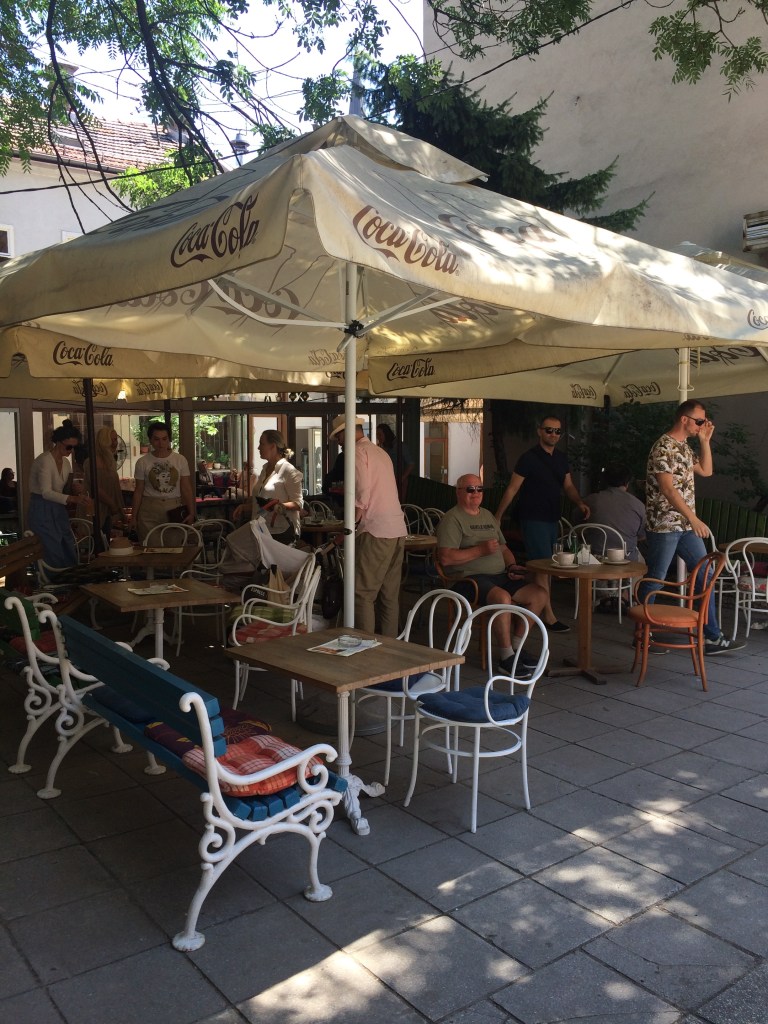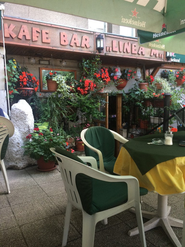 På modsatte side af floden Miljacka, (floden der løber gennem Sarajevo), fandt vi Kafe Linea M, åben fra kl. 8 -23 alle dage. Caféen ligger kun 3 m fra floden og med udsigt lige over til den smukke gamle gule Universitets bygning. Tilsyneladende er størstedelen af gæsterne stamgæster i caféen og kommer ovre fra universitetet.
