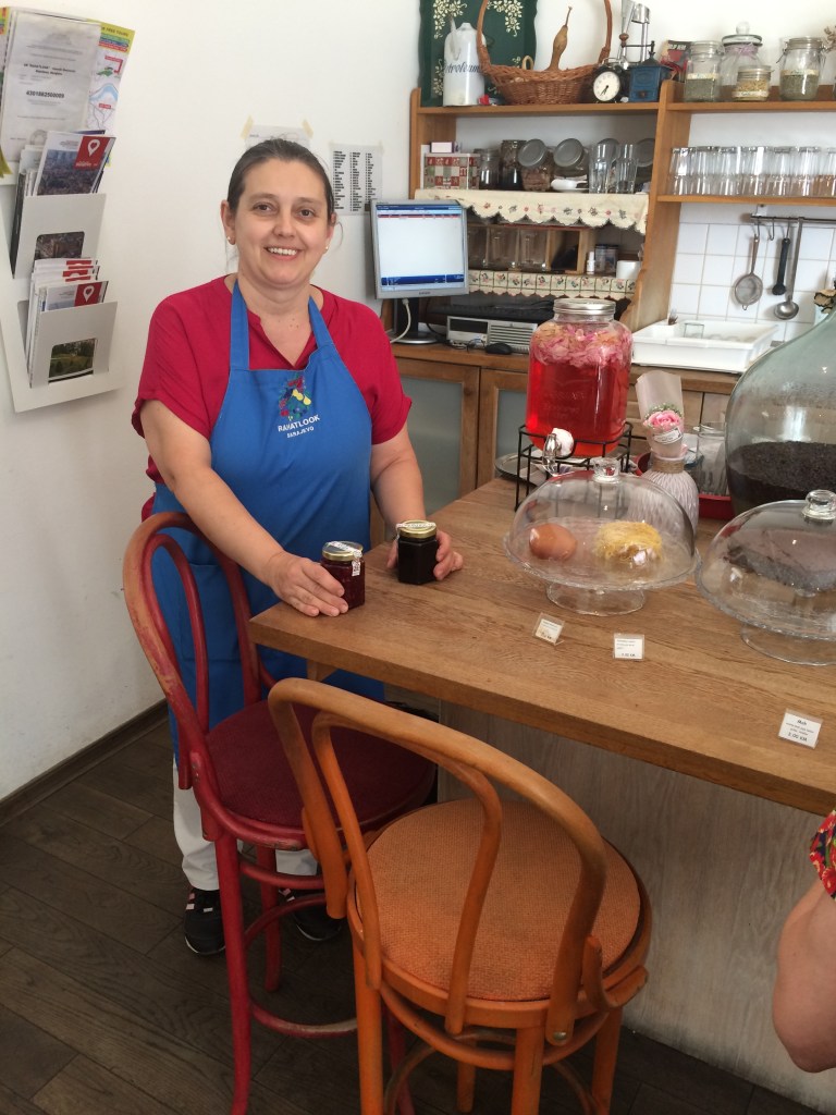 Med museet som nabo, (den tidligere synagoge), ligger Café Rahatlook, åben fra kl 9-22 hver dag. Caféen ejes af den forhenværende sygeplejeske Snjezana, som hellere selv vil bage, sylte og lave skønne juicer og som går meget op i hvilke urter og blomster der har en helbredende virkning. Snjezana er bl.a. kendt for sin rose juice, som hun selv laver af en speciel rose sort, der kun blomstrer i maj måned hjemme i hendes have, og som er god til at sænke feberen. Der bages hver dag og bagværket skifter næsten fra dag til dag. Caféens udendørs serveringsareal har dejlig skygge fra parasollerne. Da vi jo befinder os i et delvis muslimsk område, er der også et lille hjørne med vandpiber. Giv dig god tid til at lytte til og tale med Snjezana. Hun fortæller med glæde om caféens menukort og også gerne om Sarajevo. Vi betalte 60 kr. for 2 te, 2 kager, 1 danskvand og 1 rosenvand