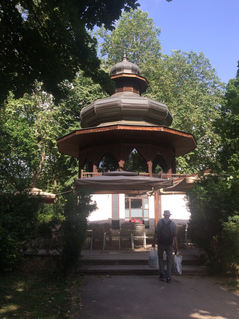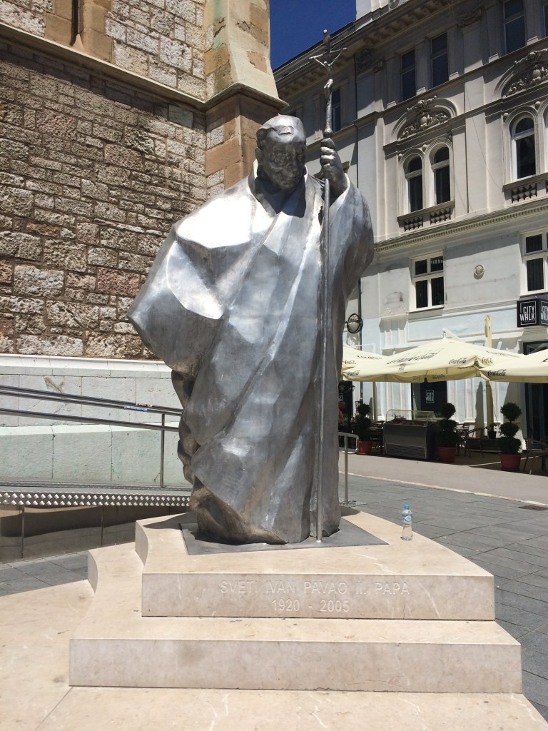 På den modsatte side af den usynlige skille linje ligger den Østrig/Ungarske gamle bydel, med huse der generelt har en etage elle to mere end bygningerne i den tyrkiske bydel. I denne bydel ligger bl.a. den store og smukke katolske Guds Moder Katedral. En imponerende og sjov sølvfarvet pave statue står foran indgangen. Ved frokosttid breder sig en herlig duft i området af ungarsk gullasch, som straks aktiverer dine slumrende smagsløg. Det er nemt at løse, for her er mange cafeer, isbarer og restauranter og ret hurtigt udså vi to caféer, som i øvrigt gik hen og blev vores favoritter.