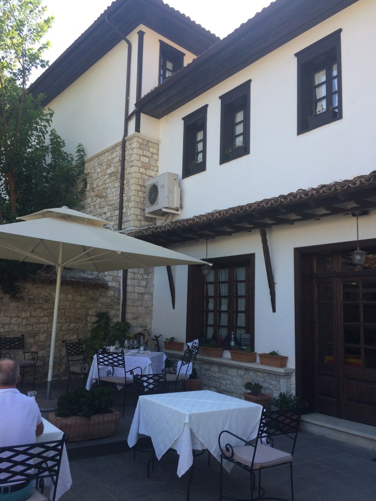 Vi blev sat af på landevejen, foran et hyggeligt lille hotelområde, ikke langt fra Berats busstation. Her var også en hyggelig restaurant med både inde-og ude servering. Kortet tilbød fortrinsvis lokale enkle retter, f.eks. ged, lam og ko, grillet på benet. Vi hyggede os med bengnaveriet i haven, mens vi sendte en venlig tanke til et par ikke eksisterende skylleskåle. Men godt smagte det. Nu var det tid at komme videre. Vi bad vor tjener bestille en taxa, men en af de lokale tilbød venligt at køre os ind til centrum, eller til den gamle bydel. Vi takkede ja, og steg ombord i hans flotte VW Touran. Hvis der ikke lige er en venlig lokal borger, eller taxa i nærheden, kan du tage bussen direkte til centrum, den afgår hvert 15. min.