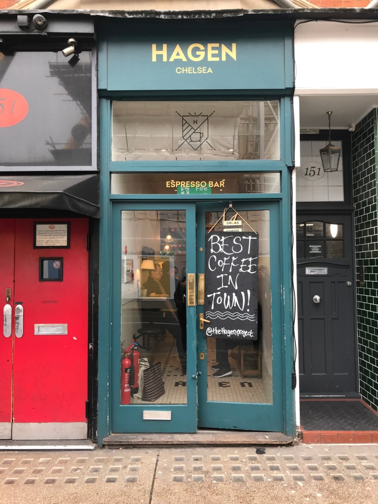 Vores søn, Niklaas, bor og arbejder i London og vi bliver præsenteret for nye cafeer og restauranter ved hvert besøg. Denne gang ville han slå et slag for Danmark og tog os med til to populære danske steder. Den danskejede kaffebar Hagen Espresso Bar i Chelsea, er kendt for sine meget velsmagende kaffer og “Danish hygge”. Hagen huser ca. 12 siddepladser og lige så mange ståpladser. Stedet er flittigt besøgt. Vi valgte to forskellige kaffer, en varm chokolade og deres citronsandkage med blå birkes – alt smagte godt. Hagen åbner kl. 7 på hverdagene og kl. 8 i weekenden. På samme gade, Kings Road, kan man bl.a. også besøge Joe and Juice, Chelsea Old Town og en Marks & Spencer