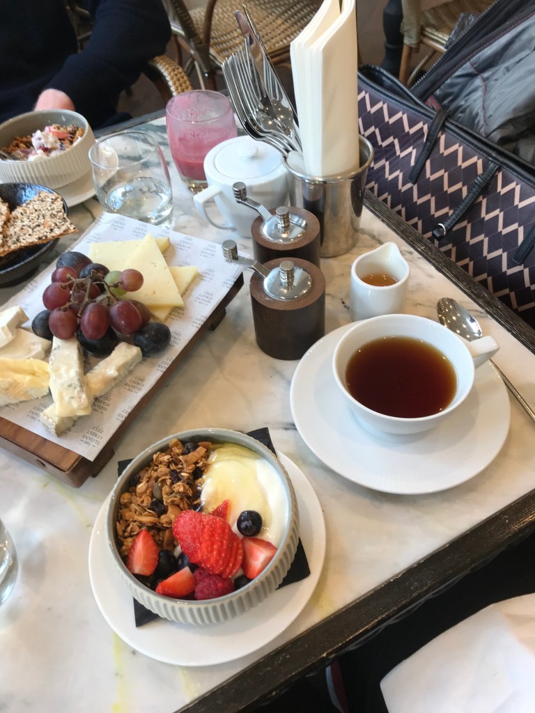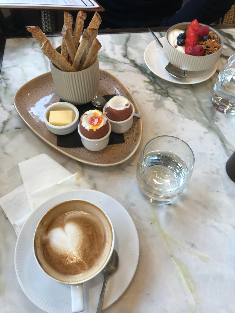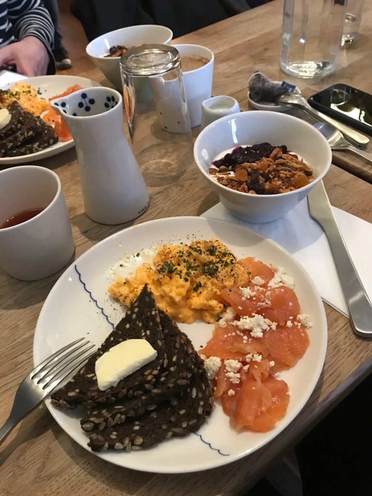 Deres morgenmenukort er alsidig og du finder sunde juicer og gode smooties. Vi var tre og valgte forskellige retter og alt var til UG. Her blev spist blødkogte æg, yoghurt med granola, egg Benedict, et skønt ostebræt med hjemmebagt knækbrød og brødstænger. Deres kaffe og te var også i top og tekanden var med en ny opfyldning. De åbner alle ugens dage kl. 9.