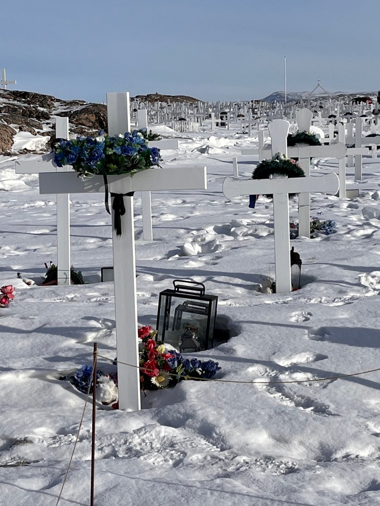 Da min ferie i Grønland var slut, tog jeg hotellets gratis minibus til lufthavnen. Den kørte forbi kirkegården med alle de hvide kors og plastik blomsterkranse. Om sommeren graver man nogle, da det om vinteren er umuligt at grave huller store nok til at nedsænke en kiste.