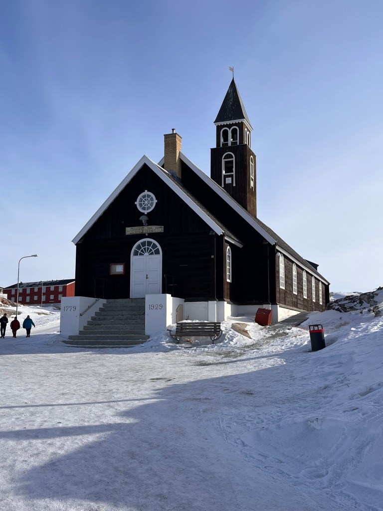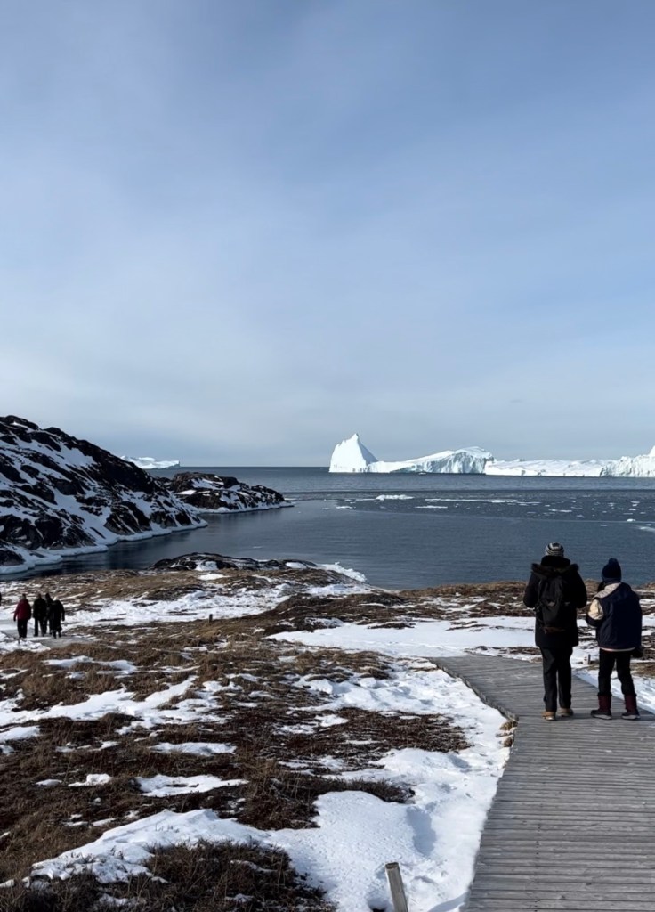I Ilulissat havde jeg booket seks overnatninger hos Hotel Hvide Falk, som ligger smukt ud til Isfjorden. Værelset skuffede ikke; jeg havde et dejligt stort værelse med altan, som bød på udsigt til det lille røde sygehus, den sorte trækirke og lidt af Isfjorden. Morgenmaden i hotellets restaurant havde en helt fantastisk udsigt, hvor jeg hver dag satte mig tidligt ved vinduet for at nyde det smukkeste syn til fjorden, tre bitte små isbjerge og Diskoøen. Sidstnævnte ligger et par timers sejlads, 113 km fra kyst til kyst, fra Ilulissat. Jeg kunne have siddet ved vinduet hele dagen, men der var mange andre smukke oplevelser, jeg havde planlagt. Så jeg drog ud i vandrestøvler og med mine tro vandrestave. Hvad jeg ikke vidste var, at sneen smeltede hurtigt på grund af det flotte vejr og i natten blev smeltevandet til skøjtebaner. Trods vandrestave – og støvler faldt jeg to gange og slog mig hårdt. Heldigvis så nogle søde mennesker fra Næstved mig og gav mig et sæt skopigge til at sætte på mine støvler. Tak for jer! Piggene kan købes på nettet fra mellem 50-100 kr og gjorde virkelig en forskel for mig.