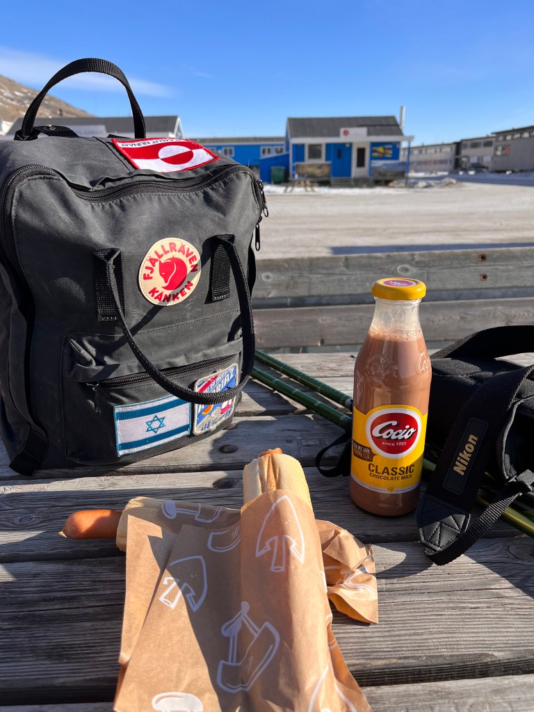 150 meter fra mit hotel lå verdens nordligste bog- og strikkecafe. Her er alle velkommen hver mandag til kaffe og strikkehygge. Det er en skøn lille cafe med en venlig dame på ca 65 år, ejerens mor, som bød på te og fortalte om gamle dage i byen, om lægen der havde byens eneste bil, om sammenholdet i byen, om fattigdommen og drikkeriet som gudskelov er blevet meget bedre. Jeg gik mod havnen hvor den store Royal Greenland Hellefisk og rejefabrik ligger og videre ud af byen mod det flotte vandrehjem, den nye politistation og verdens nordligste 5-stjernede hotel, Hotel Arctic. Hotellet er flot beliggende med den fedeste store træterrasse og en ufattelig smuk udsigt. Jeg spiste frokost deroppe to gange og begge gange valgte jeg deres store salatanretning med friskfangede rejer fra Isfjorden.